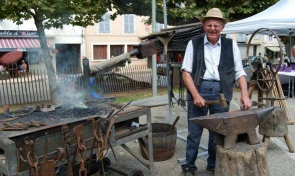 Avec sa forge, en démonstration ! Accompagné des 4 éléments : le feu, l'air, la terre et l'eau , le forgeron martèle, tord, aplatit, pétrit le métal et donne vie aux ouvrages.