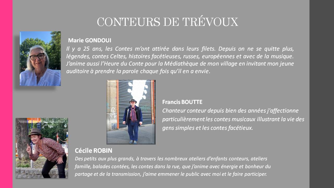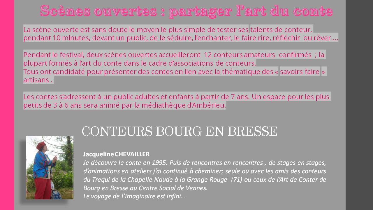 | Conteurs amateurs bien confirmés concoctent deux représentations pétillantes et farcies de sucreries chantées Public : adultes et enfants à partir de 7 ans Sam 8 et dim 9 octobre à 17h15 Voir programme du Festival "Artisans tous en scène"